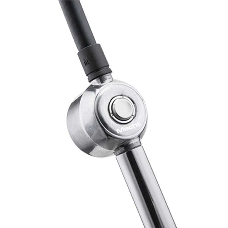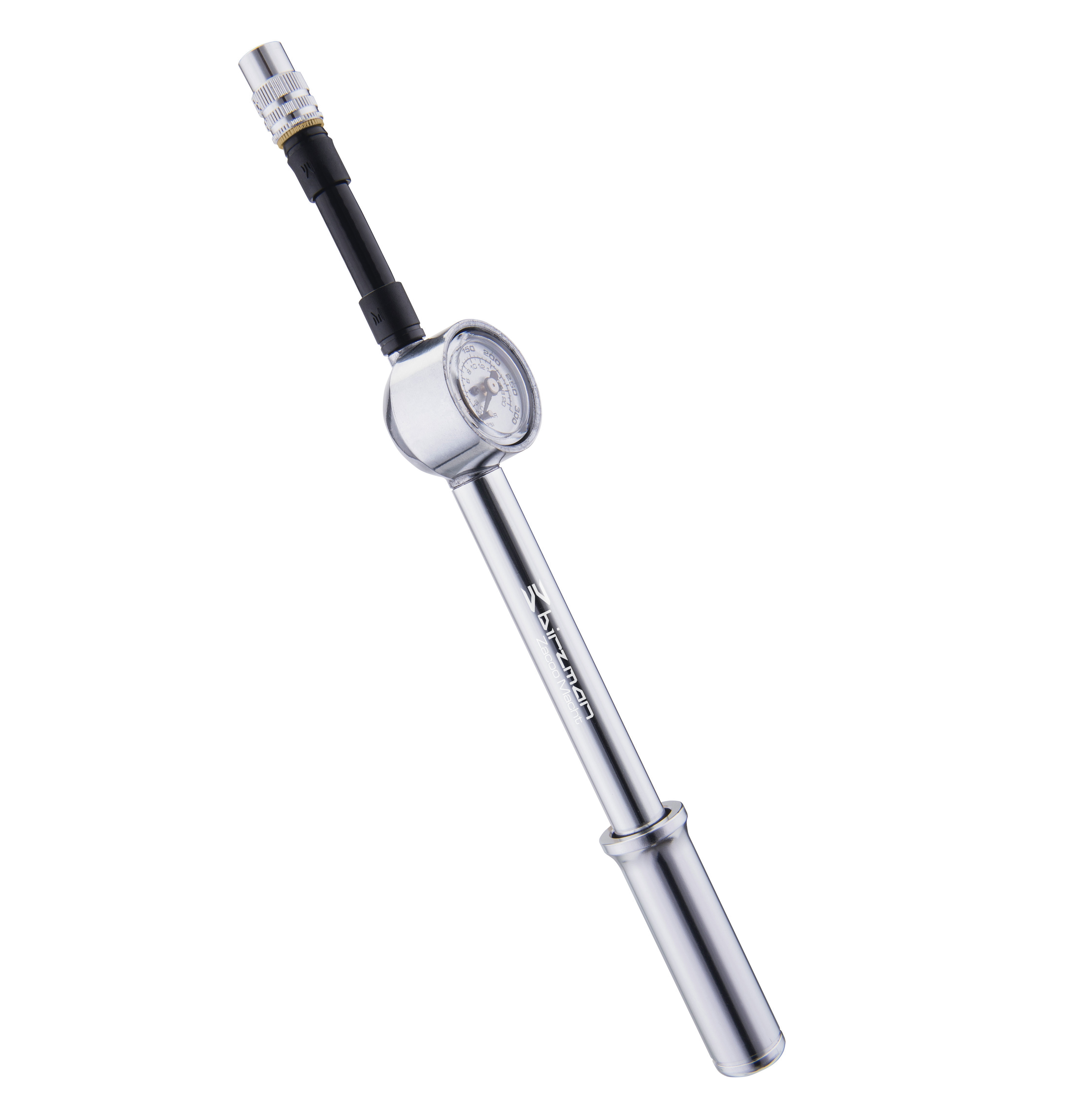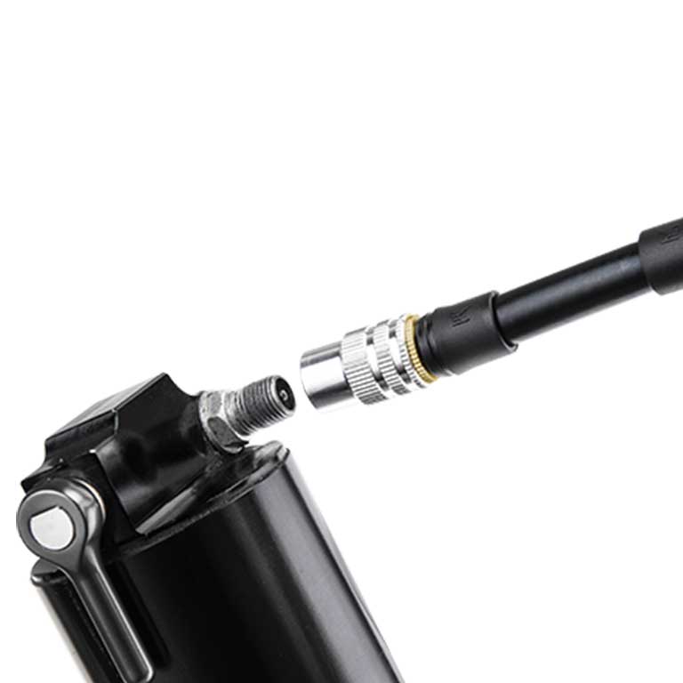 エアロックバルブ採用で着脱時のエア抜けが少なくなり正確に空気圧を管理。メーター裏側の減圧ボタンも大きく使い易くなったサスペンション用ポンプ。